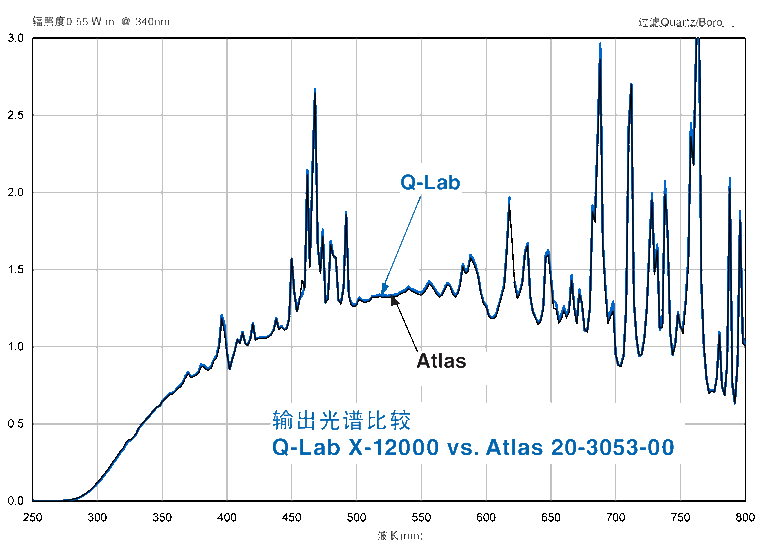 當(dāng)使用相同的Atlas過(guò)濾器時(shí),X-6500 氙燈燈管的輸出光譜可保證與Atlas 20-6500-00氙燈燈管的輸出光譜一致,X-12000氙燈燈管的輸出光譜可保證與Atlas 20-3053-00氙燈燈管的輸出光譜一致。