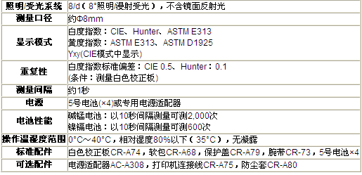 使用白度指數(shù)(CIE或亨特爾)指示食品和原材料的白度。測量口徑為8mm。測量、數(shù)據(jù)處理、顯示的三個部位一體化設(shè)計。小型輕便的手提式設(shè)計。可以測量粉體或粘稠狀物體。